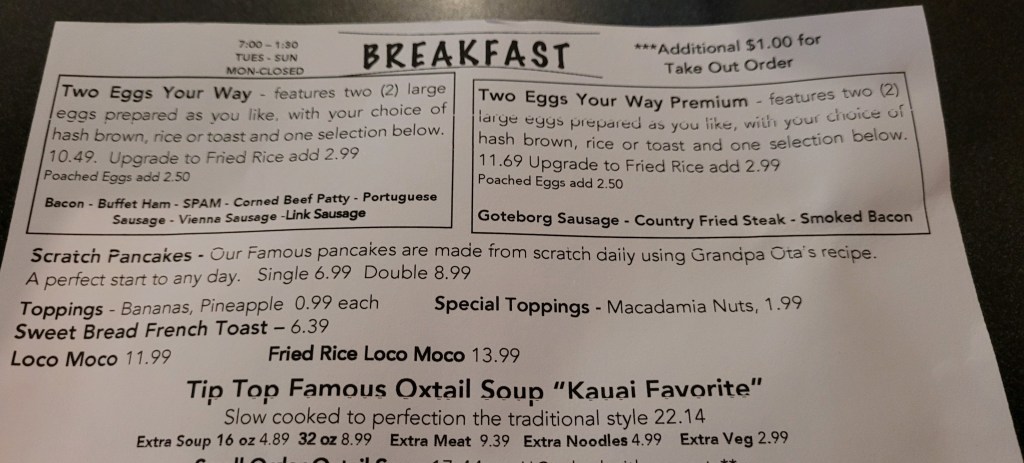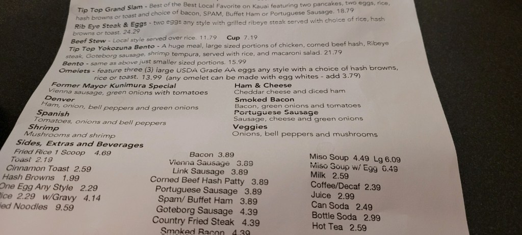 My memories of Kauai are connected to food. Hamura Saimin. Ono Burgers. Bull Shed. It is one of those places that I feel most at ease in. Hawaiian Airlines helped spark the desire to go to the Garden Isle by selling $39 one-way tickets. It is one those places that I have wonderful memories with my mother. Dad was working on Uncommon Valor. We ate at Ono Burgers, Hamura’s, Bull Shed, and Waipoli Cafe. The idea of going back to Kauai made all those memories rush back. These are not owned by people, that I know of. We were headed to Unko’s for breakfast. I called Cheryl R. and told her my plans and she explained that in Kauai on a Sunday, it is best to call to make sure a place is open. After no one answered the phone, Cheryl suggested TIP TOP CAFE and explained that this was where locals go.