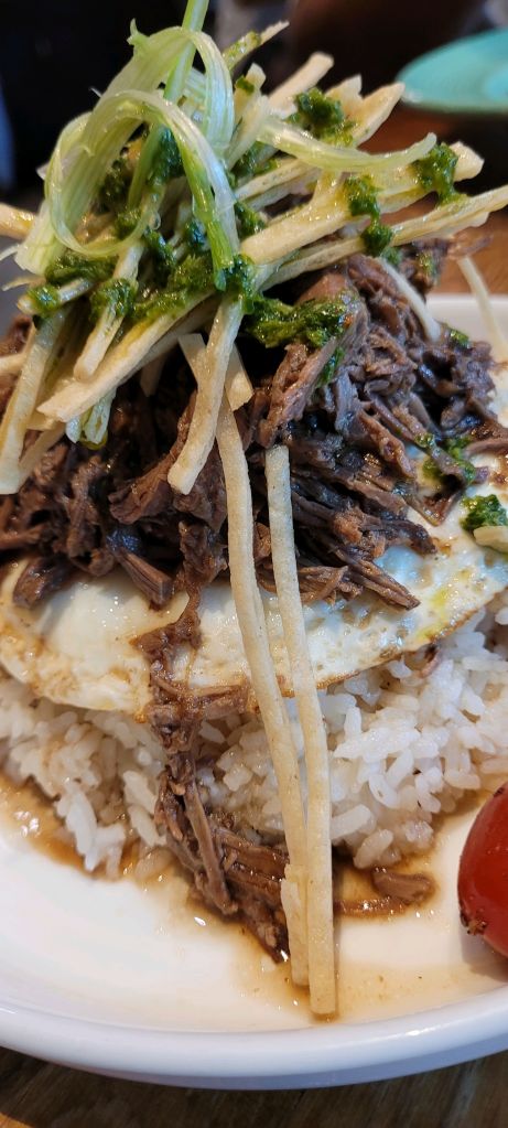 Tip Top Cafe is located in Lihue, not far from the airport. There is an attached motel and lots of parking. However…there is a line to get into the the cafe. When we stood in line, a person in the line told me that the line moves quickly. Cheryl told me that there used to be an hour limit of time in the restaurant. We were seated quickly. Cheryl recommended the fried rice loco moco, which she said I would love because I love salty food. Cheryl also recommended the oxtail soup, which I didn’t know places serve during breakfast. In fact, on Oahu it seems like oxtail soup is more a later in the day soup that is super expensive.