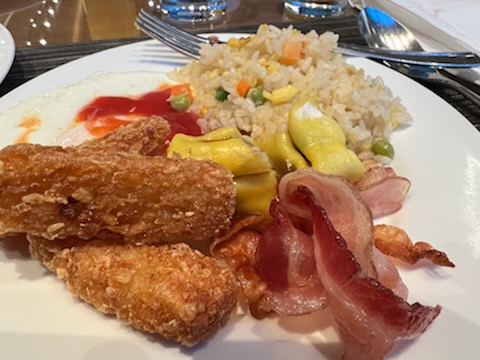 Tip Top Cafe is located in Lihue, not far from the airport. There is an attached motel and lots of parking. However…there is a line to get into the the cafe. When we stood in line, a person in the line told me that the line moves quickly. Cheryl told me that there used to be an hour limit of time in the restaurant. We were seated quickly. Cheryl recommended the fried rice loco moco, which she said I would love because I love salty food. Cheryl also recommended the oxtail soup, which I didn’t know places serve during breakfast. In fact, on Oahu it seems like oxtail soup is more a later in the day soup that is super expensive.